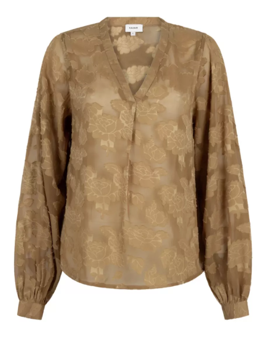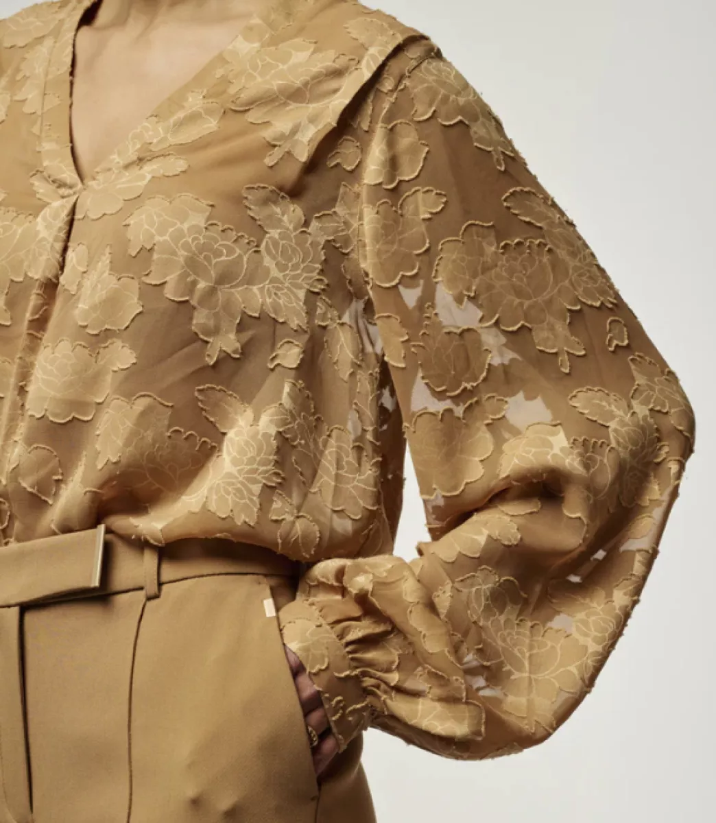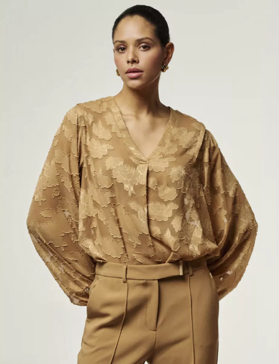 Deze elegante blouse met subtiel bloemendessin is perfect voor een vrouwelijke, verfijnde uitstraling. De licht doorschijnende stof met reliëfstructuur geeft een luxe gevoel, terwijl de halslijn en licht gepofte mouwen zorgen voor een moderne touch. Ideaal om zowel dagelijks als feestelijk te dragen.