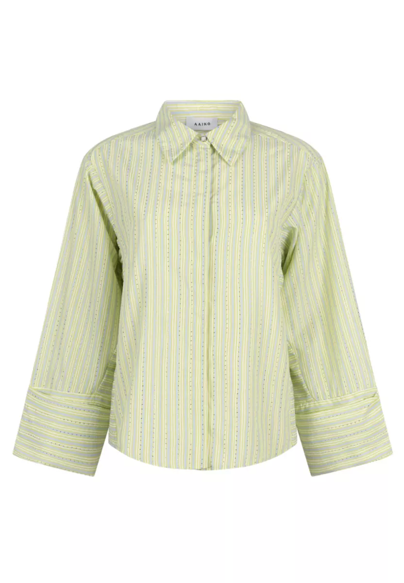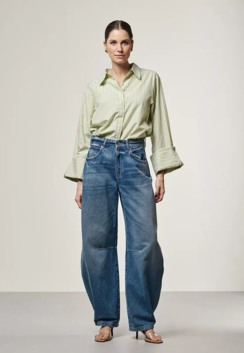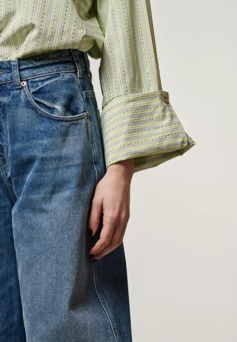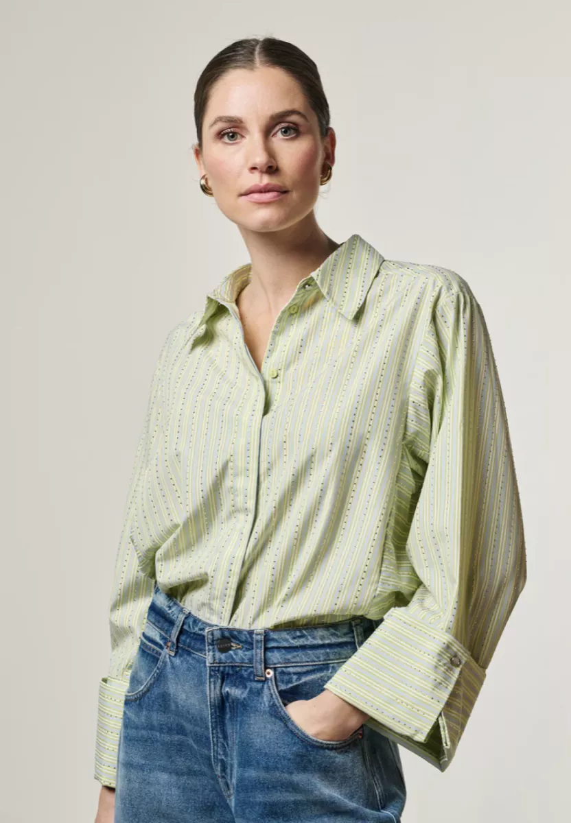 De Elda Blouse is een losvallend model met een klassieke kraag en opvallende brede manchetten. Het gestreepte dessin is subtiel verwerkt met strassdetails die zorgen voor een lichte shimmer. Gemaakt van een gladde, licht glanzende stof die soepel valt en comfortabel draagt.