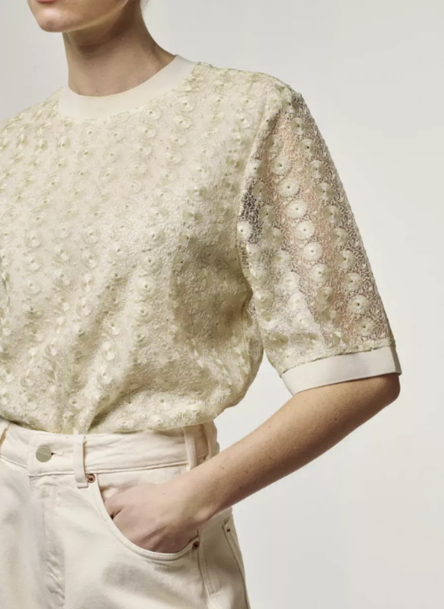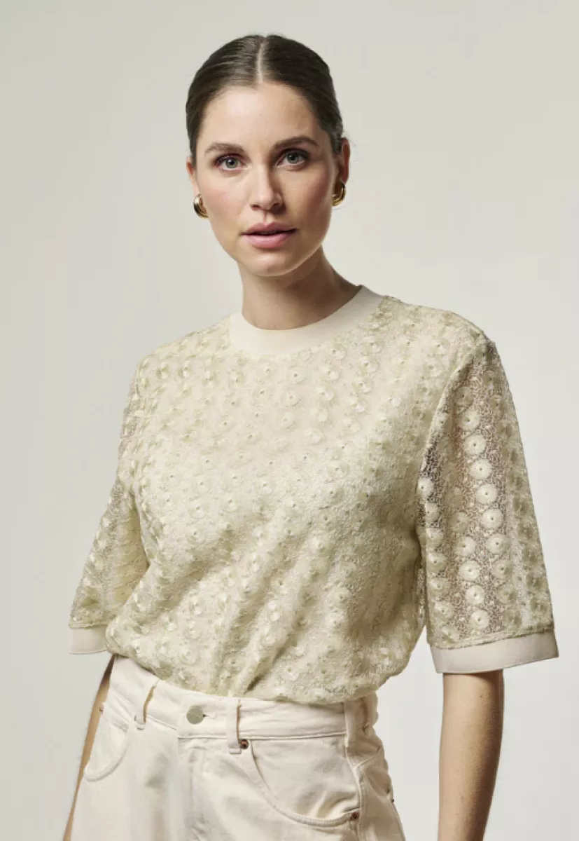 De Julice top is een vrouwelijke top met een rustige uitstraling. De jacquardstof heeft een licht glanzend effect en een fijn patroon. De pasvorm is recht en comfortabel, met korte mouwen en een ronde hals. De boorden in een contrasterende kleur zorgen voor een nette afwerking. Een stijlvol item dat makkelijk te combineren is.
