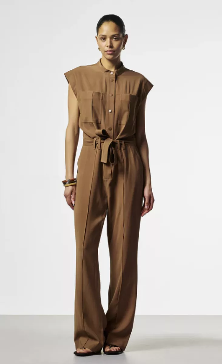 Deze jumpsuit heeft een krachtige en elegante uitstraling. Het mouwloze model met opstaande kraag en knoopsluiting geeft een moderne touch, terwijl de rechte, soepelvallende broekspijpen zorgen voor een tijdloos silhouet. De tailleceintuur accentueert het figuur en creëert een vrouwelijk effect.