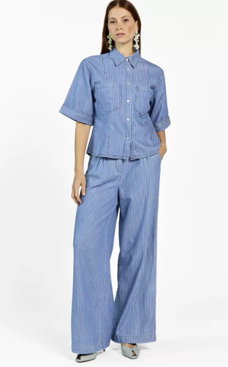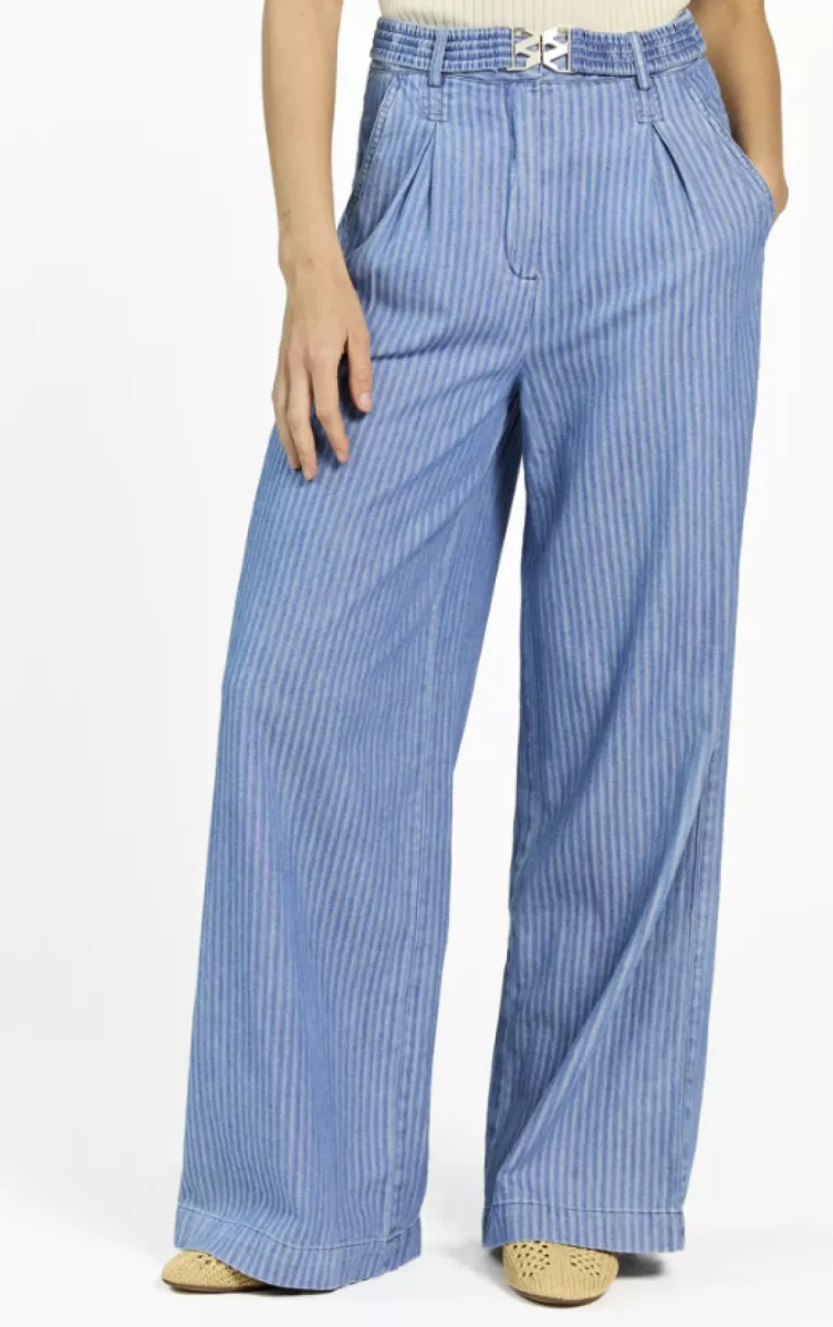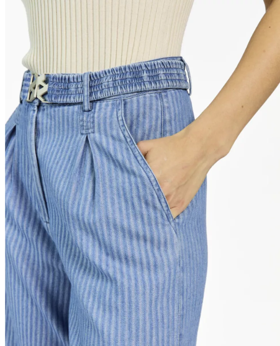 Deze broek is uitgevoerd in een soepele denimstof met een verfijnd streeppatroon. Het model heeft een hoge taille met plooidetails aan de voorzijde en wijde, rechte pijpen voor een elegante pasvorm. De elastische tailleband zorgt voor extra comfort. Goed te combineren met de blouse Serene voor een complete en stijlvolle look.