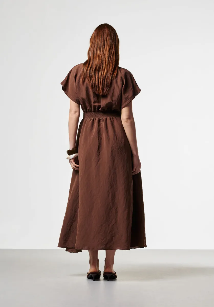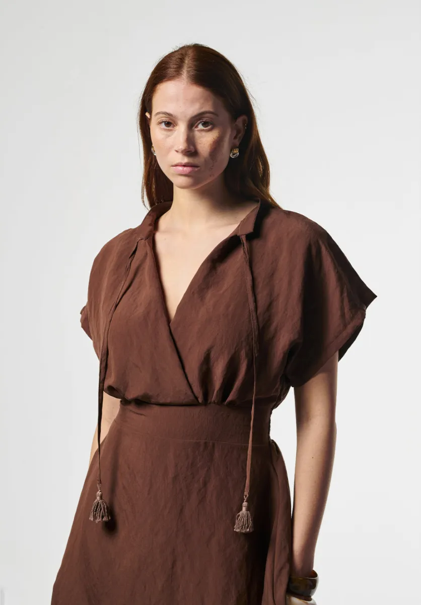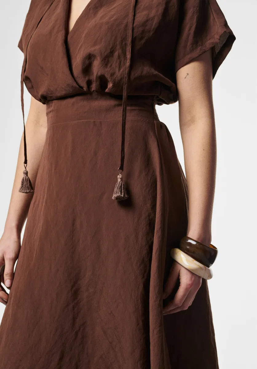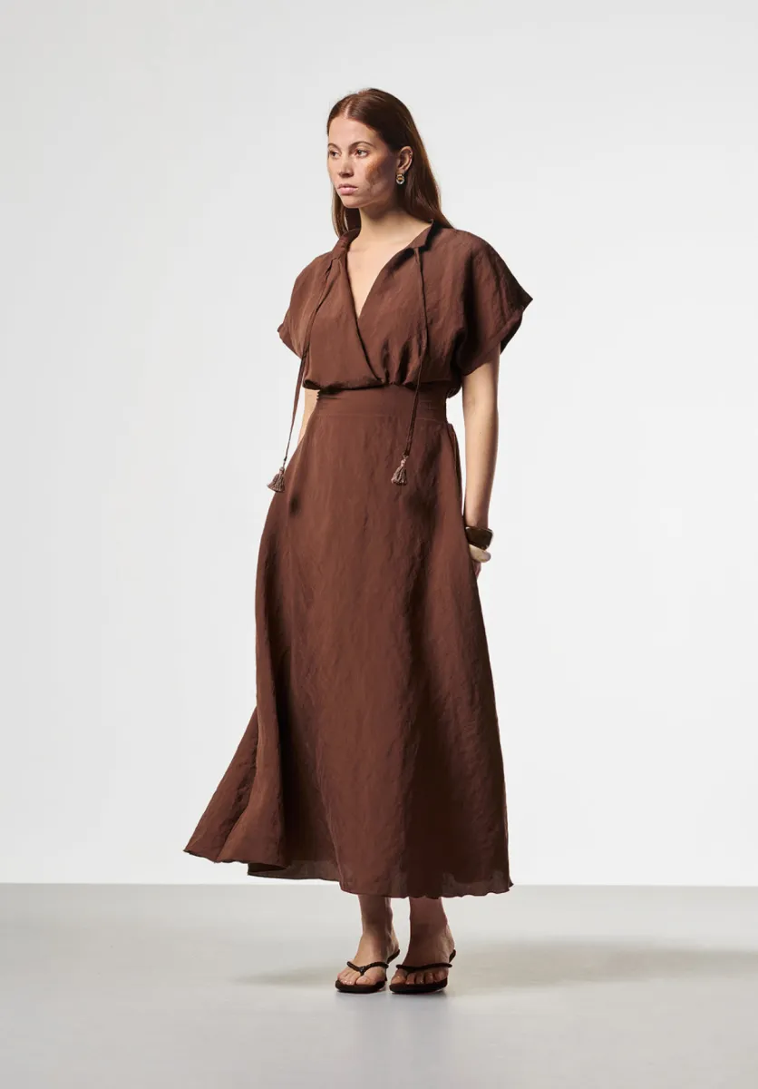 Jurk Serra is uitgevoerd met een overslaghals en een brede tailleband die het silhouet benadrukt. De midi-lengte rok valt soepel en beweegt licht mee. De strikdetails geven een subtiel accent aan het ontwerp.