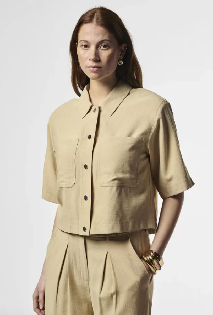 Deze blouse heeft een stoere en moderne uitstraling. Het korte model met kraag en knoopsluiting geeft een eigentijdse look, terwijl de borstzakken zorgen voor een subtiel utilitair detail. De rechte pasvorm maakt de blouse makkelijk te combineren.