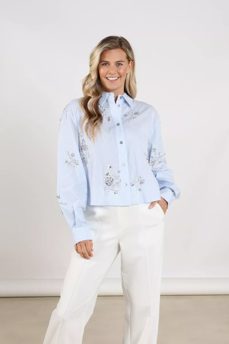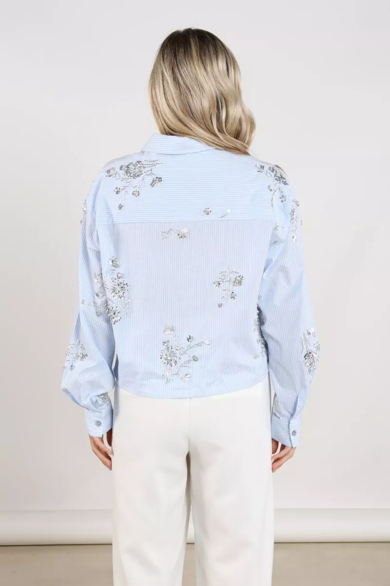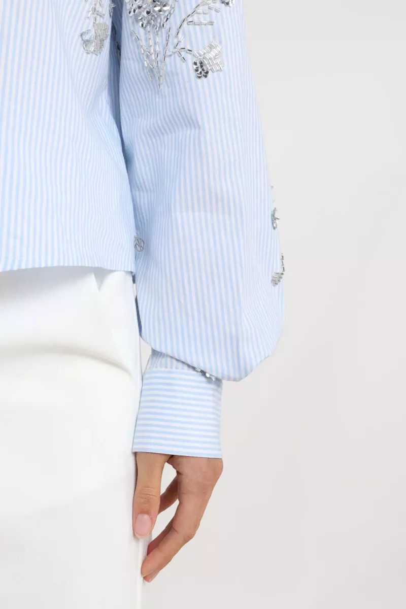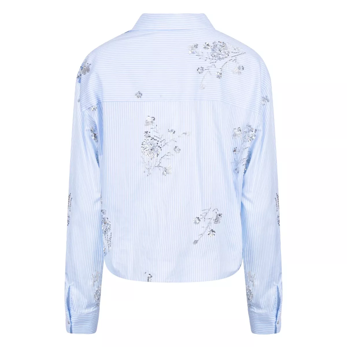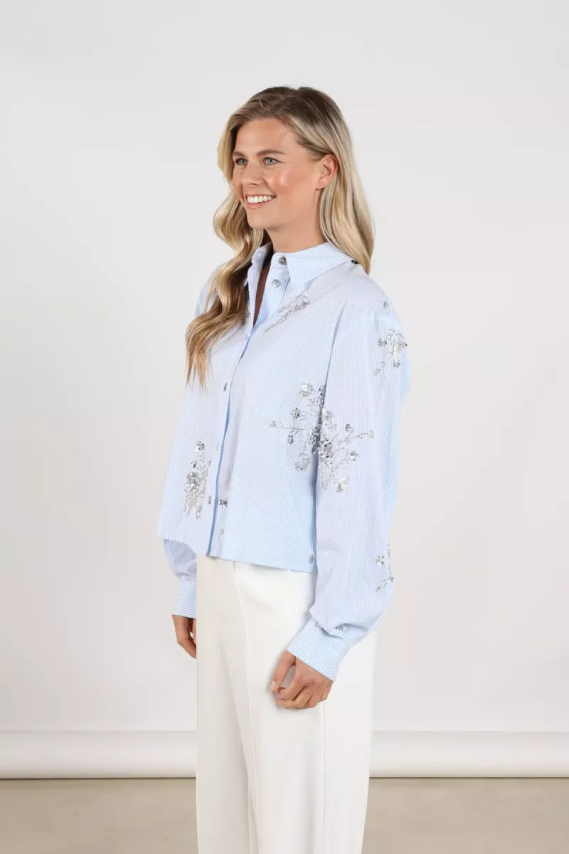 Deze lichtblauwe blouse straalt elegantie uit. Het kraagje en de blinde sluiting zorgen voor een clean en verfijnd silhouet. De zilvere pailleten geeft de blouse een luxe touch. Voorzien van lange mouwen en perfect om zowel chic als stijlvol casual te dragen.