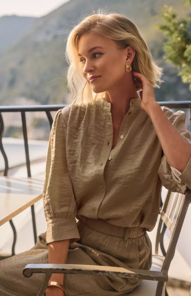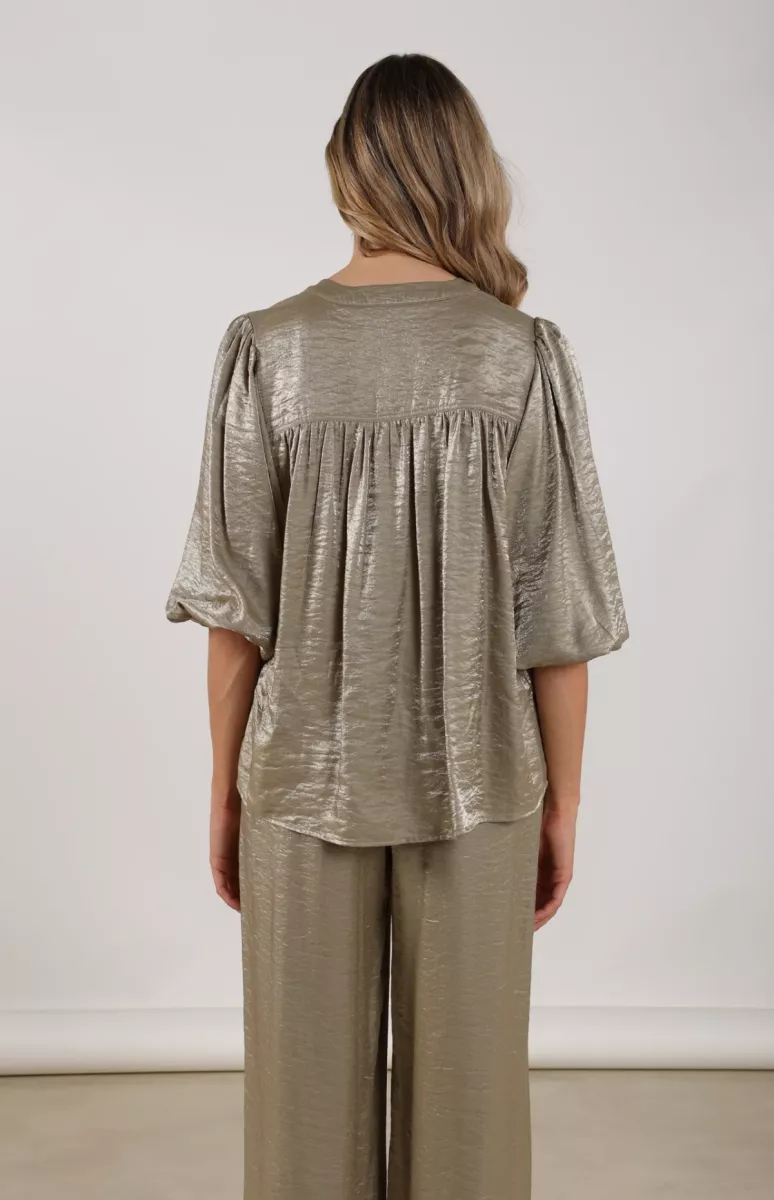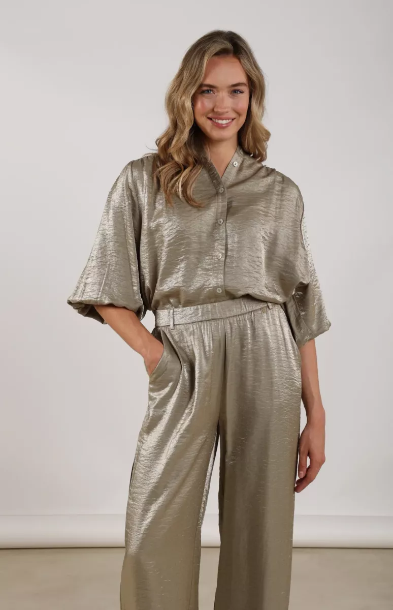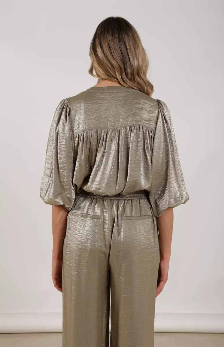 De Blouse Lilly Shiny Army van Nukus geeft je outfit direct een luxe touch. De subtiele glans en soepelvallende stof zorgen voor een elegante look, terwijl de losse fit en korte mouwen het geheel nonchalant en comfortabel houden. Perfect voor zowel casual chic als avondlooks.