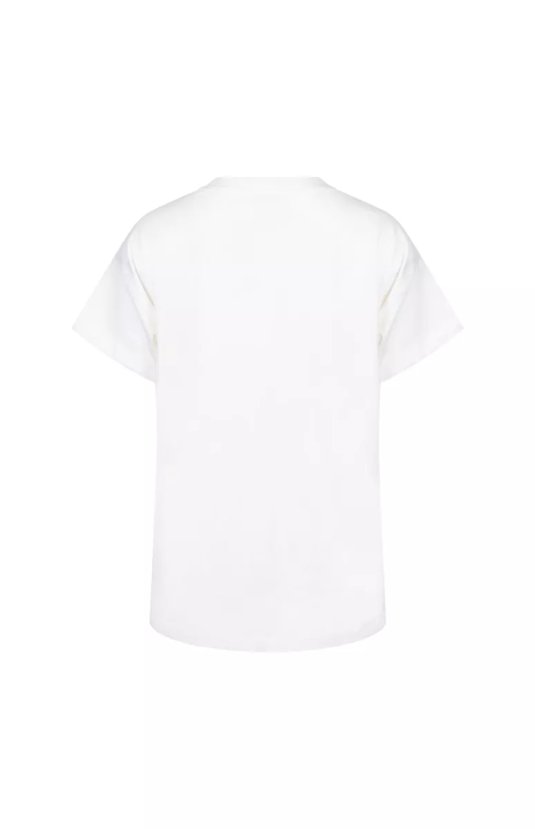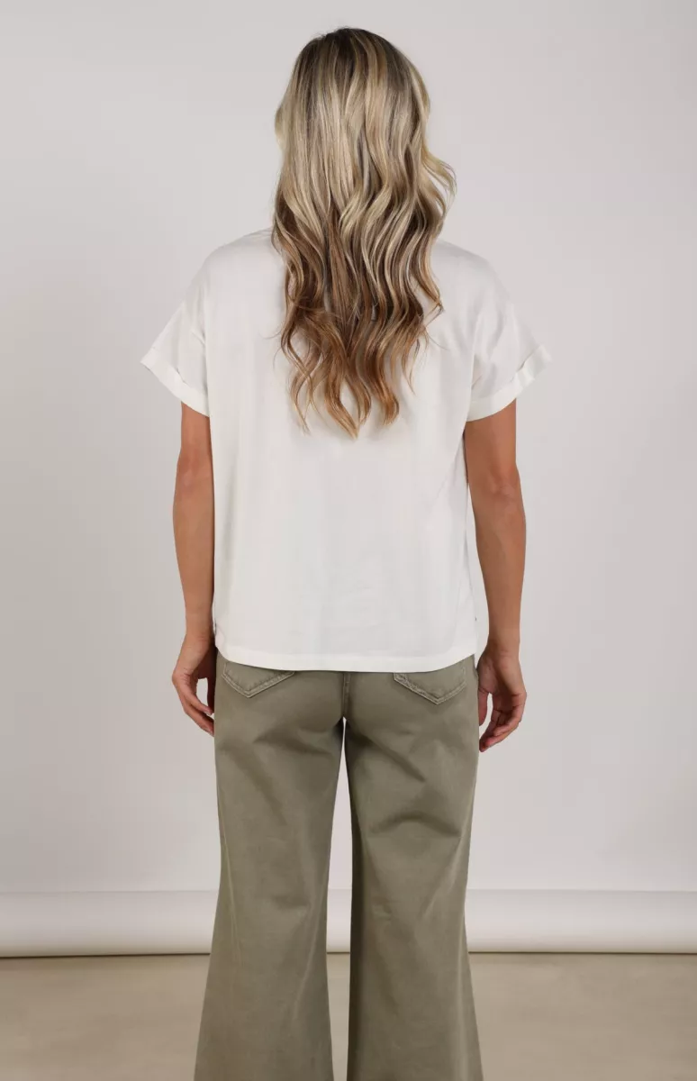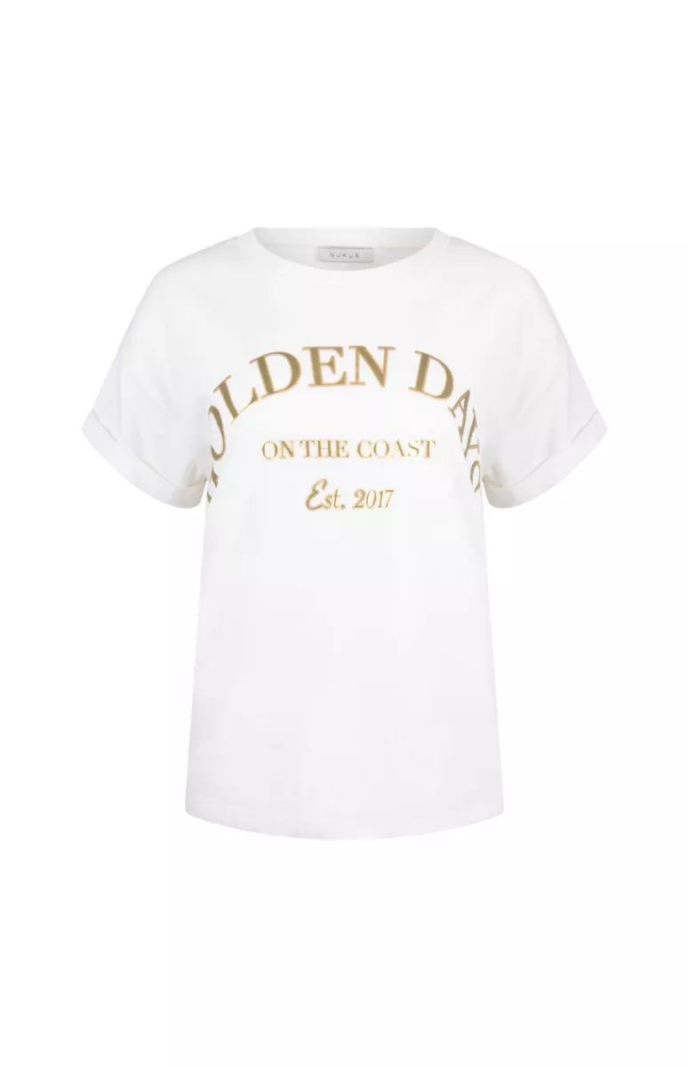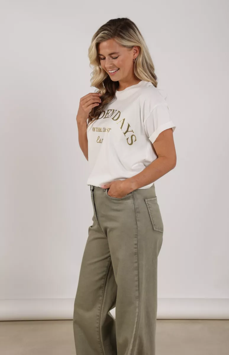 De T-shirt Sanne Golden Days Offwhite Army van Nukus is een casual top met ronde hals. Zachte katoenjersey, opgerolde mouwtjes en goudkleurige tekstprint zorgen voor een relaxte, zomerse look. Perfect voor een vrije dag.