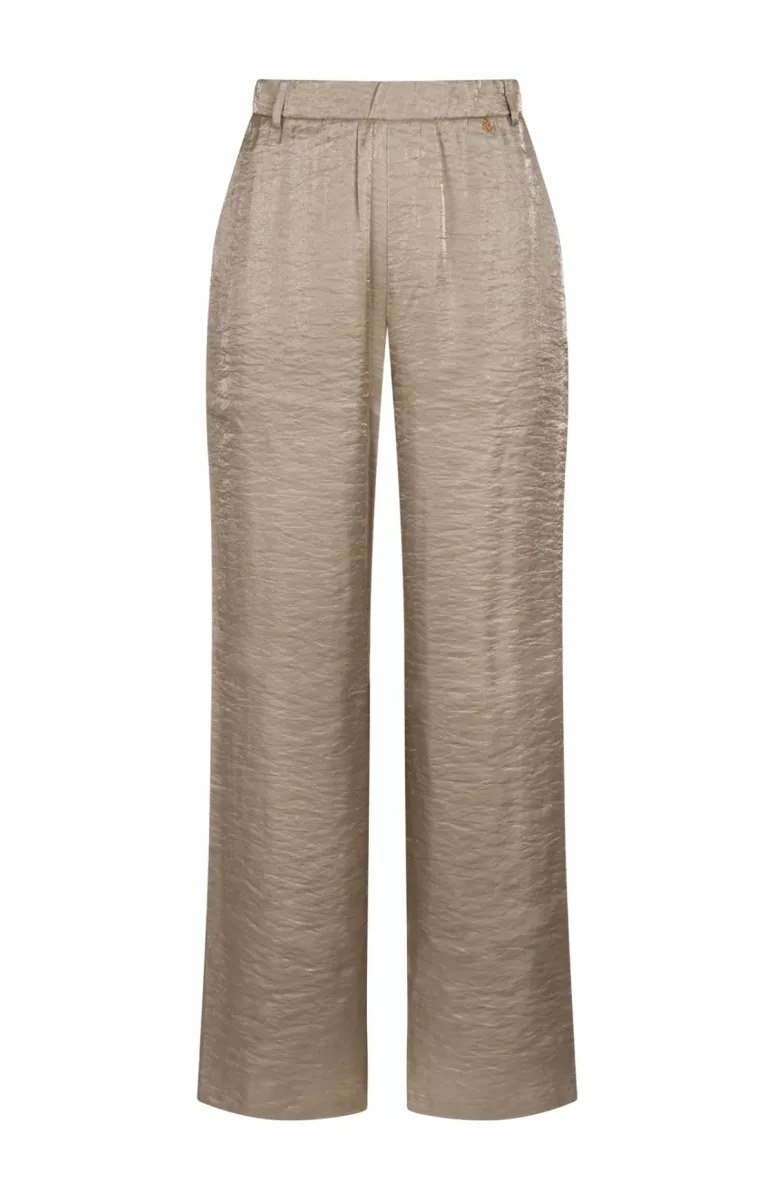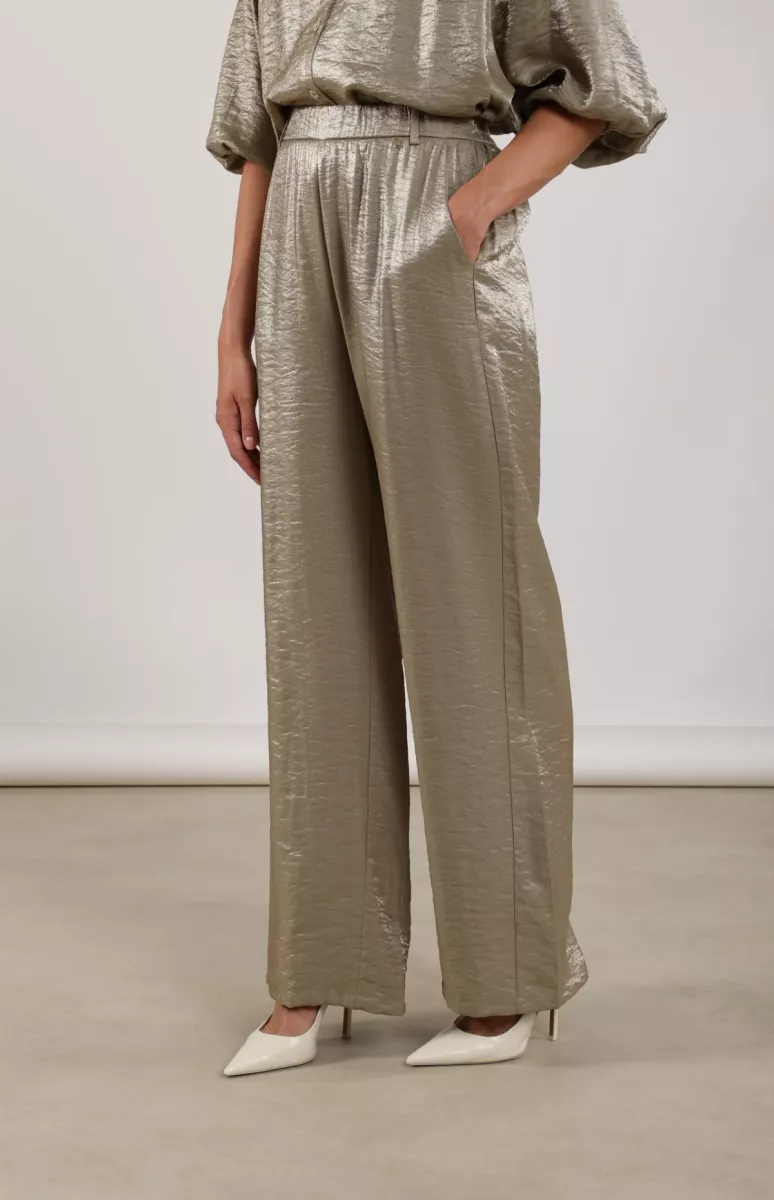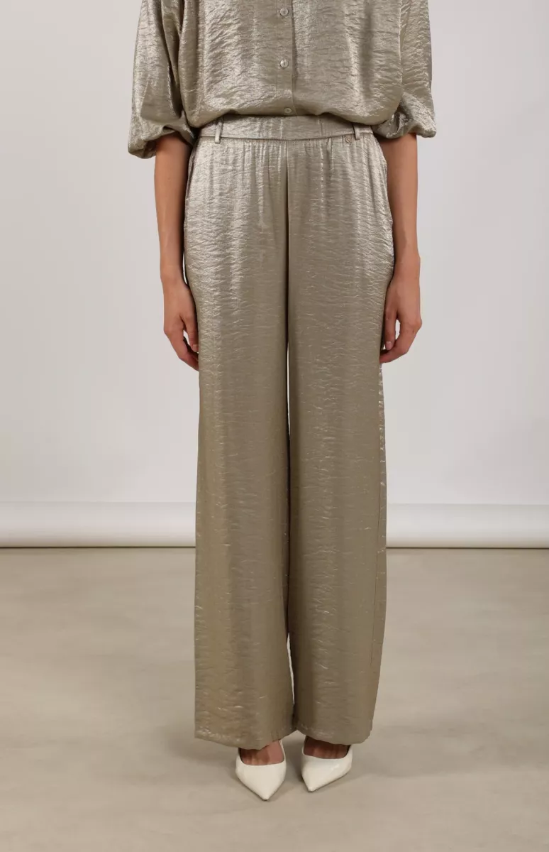 De Broek Linsey Army van Nukus is een vrouwelijke, glanzende broek met hoge taille en rechte, wijde pijpen. De soepele shiny stof en elastische achterkant van de taille geven veel draagcomfort. Perfect voor een chique maar relaxte look.