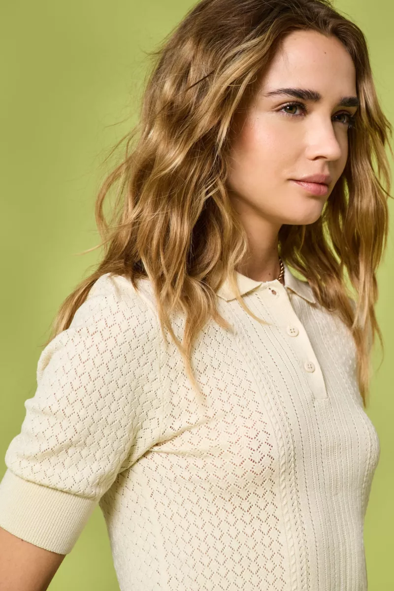 Blijf warm en gezellig met zachte gebreide stijlen, perfect voor elke gelegenheid en elk seizoen. Plat breiwerk is een soort breien dat wordt gekenmerkt door zijn flexibiliteit, comfort en strakke uitstraling. – Producttype : Gebreide polohals – Hals : Polo – Mouw : Korte mouwen – Manchetten : Geribbelde manchetten – Sluiting : Halve knoopsluiting – Pasvorm : Slim Fit