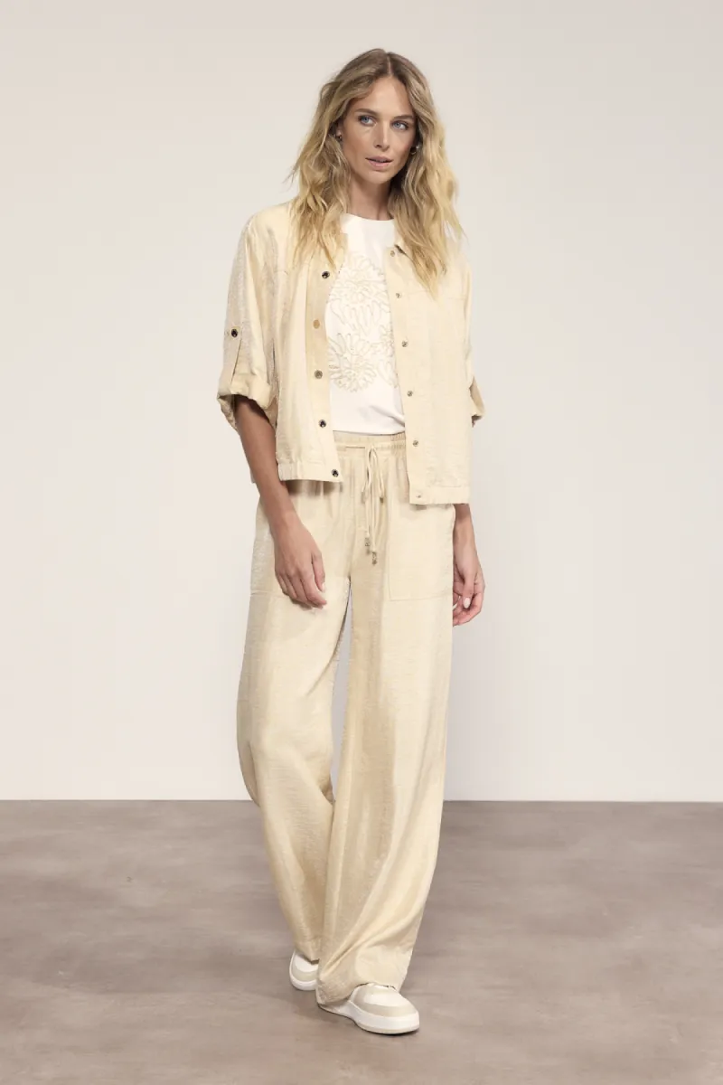 De Shimmer Wide-Leg Trousers is een elegante en moderne broek met een subtiele glans en een verfijnd, vrouwelijk silhouet. Deze trousers is vervaardigd uit een comfortabele stofmix van 85% katoen en 15% polyamide, wat zorgt voor een ademend draaggevoel, een lichte structuur en een prettige bewegingsvrijheid. De shimmer finish geeft het ontwerp een luxe en eigentijdse uitstraling, terwijl de wide-leg pasvorm zorgt voor een vloeiende, elegante valling en een flatterend silhouet. De elastische tailleband met strikkoord voegt extra comfort toe en maakt de broek zowel praktisch als stijlvol. Uitgevoerd in de zachte, neutrale kleur Pebble is deze trousers moeiteloos te combineren met verschillende looks. Draag de Shimmer Wide-Leg Trousers met een bijpassende top of jacket voor een stijlvolle co-ord look, of combineer met een blouse of knit voor een moderne, casual-chique outfit. Een veelzijdige broek die comfort, subtiele glans en eigentijdse elegantie perfect samenbrengt.